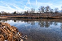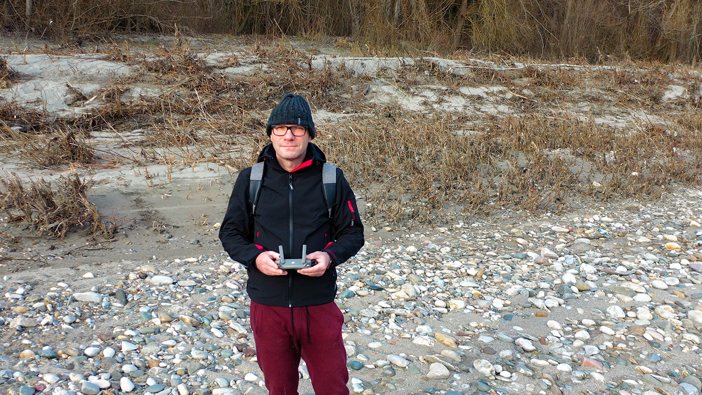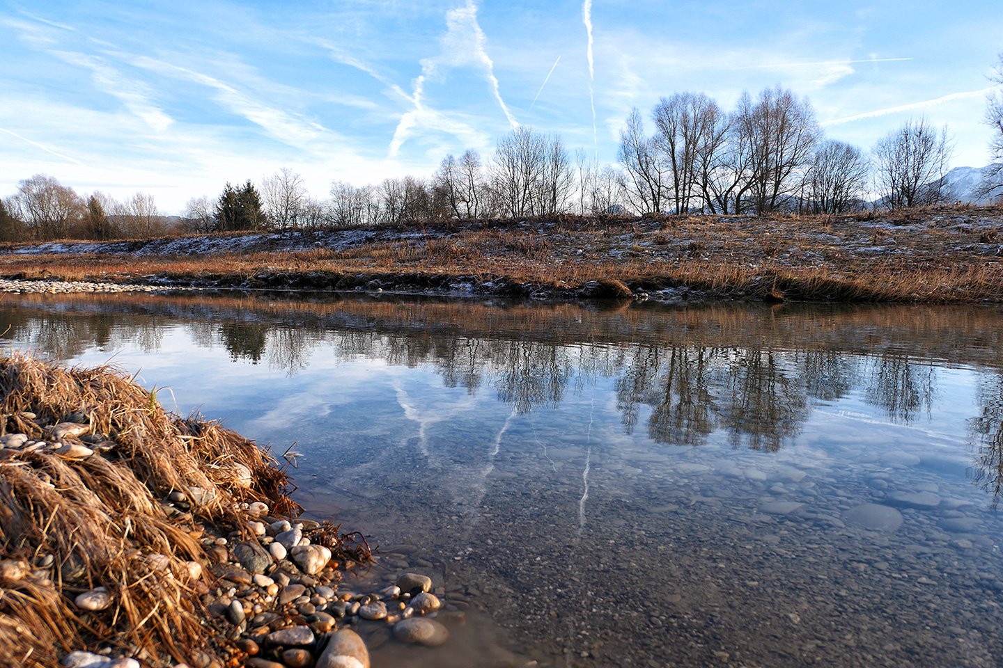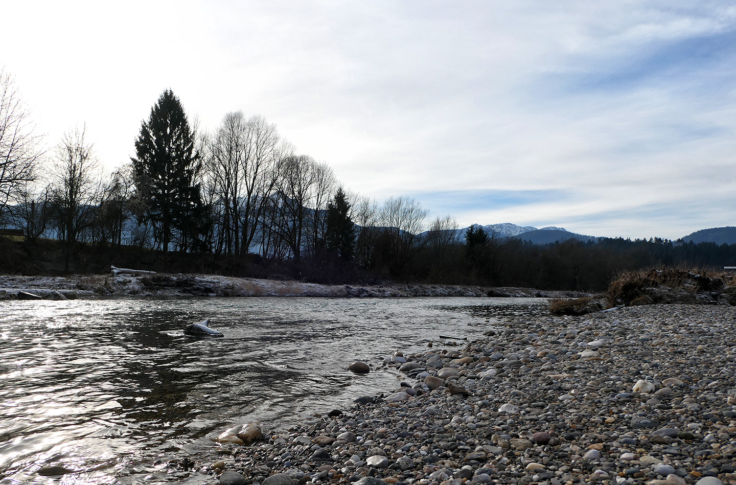 Heute nachmittag habe ich mich auf eine kleine Drauexpedition gemacht und bin mit meiner Gimbal-Kamera flussaufwärts spaziert. Durch die kalten Nächte hat sich ein bisschen Eis gebildet, das aber noch nicht tragfähig ist. Die Drohne hatte ich auch dabei, bin aber nicht viel geflogen.